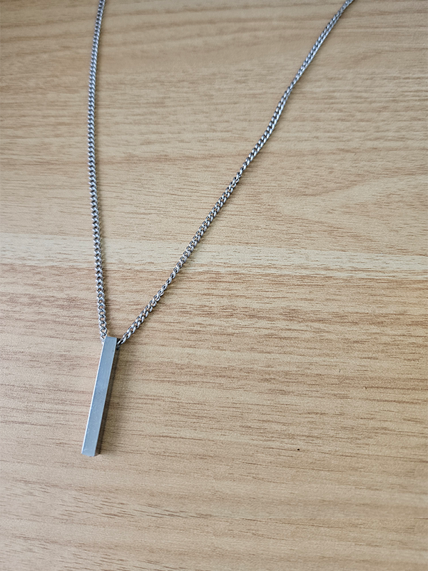 שרשרת ‘שחר כסף’ משלבת תליון מלבן גיאומטרי ושרשרת כסף סטיינלס סטיל (מתכת אל-חלד המצופה כסף, עמידה למים ואינה משחירה).