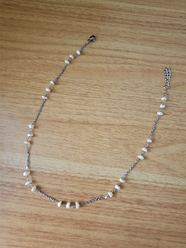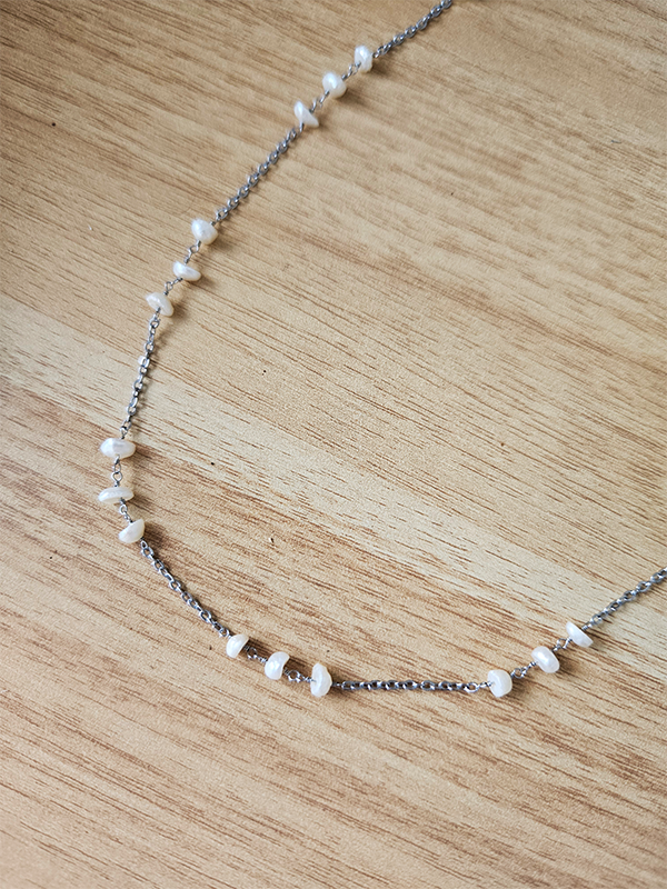 השרשרת ‘לוקה’ משלבת פנינים עם שרשרת כסף סטיינלס סטיל (מתכת אל-חלד המצופה כסף, עמידה למים ואינה משחירה).